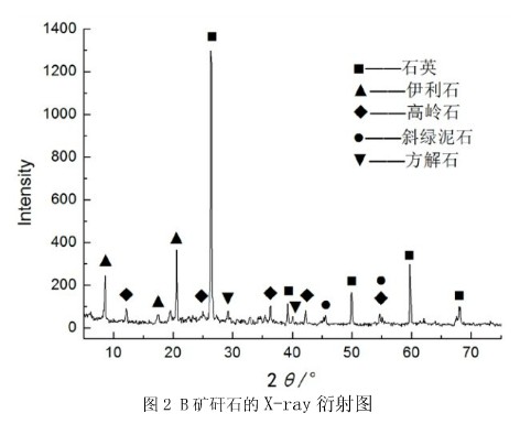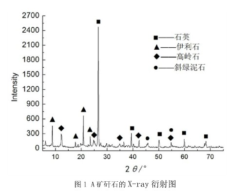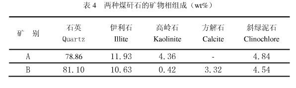 未了解兩種煤矸石的礦物組成,對它們分別進行物相分析,其X-ray衍射圖如圖 l 、圖 2 所示。從中可以看出, A 礦矸石的主要礦物相為石英、高齡石和伊利石和斜綠泥石;B礦矸石的主要礦物相為石英、高嶺石、伊利石、斜綠泥石和方解石。兩礦矸石中各礦物相含量見表 4 。