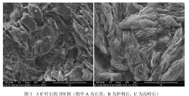 圖3 是 A 礦煤矸石典型的顯微結構照片。可以看出,該礦主要由 A 、 B 、 C 三種晶相構成,結合EDS能譜分析知道, A 為石英、 B 為高嶺石、 C 為伊利石。石英晶體結構致密、沒有很明顯的棱角結構,高嶺石土要呈層狀薄片結構、紋理比較清晰,伊利石多以解離塊狀形式存在。這與前面礦物相分析結果是一致的。