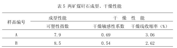 由表4可知:B礦的成型性能略好于A礦,A礦和B礦的干燥敏感性系數小于l,適宜于快速干燥,則A礦和B礦都適宜制磚。