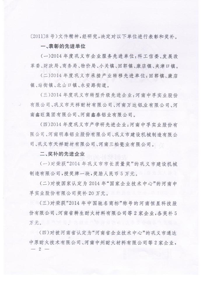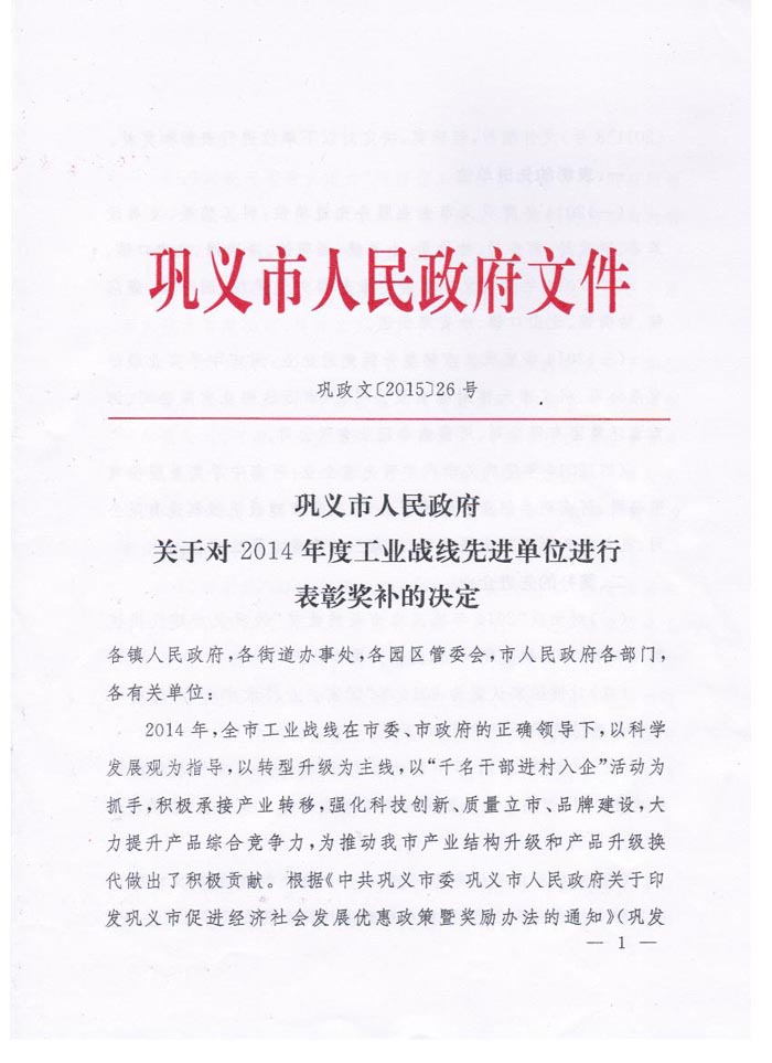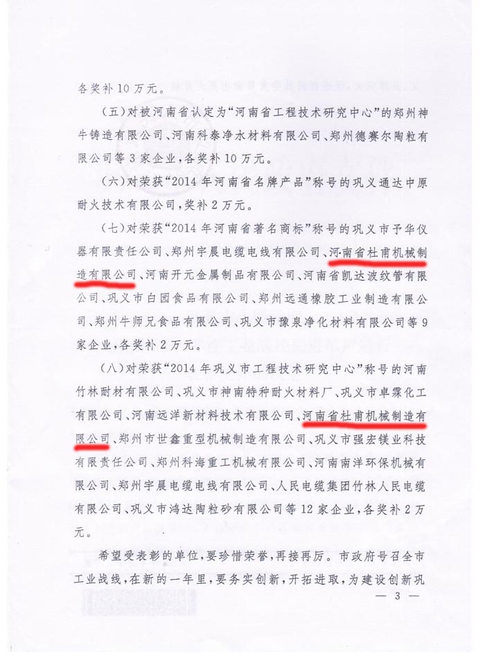 對包括我公司-河南省杜甫機(jī)械制造有限公司在內(nèi)的12家榮獲“2014年鞏義市工程技術(shù)研究中心”稱號的企業(yè)各獎補(bǔ)2萬元。