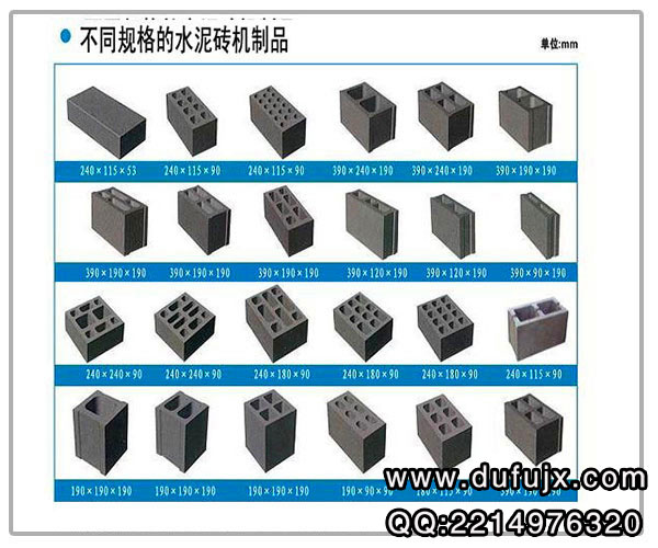 1、市場上比較常見的水泥磚機的制品的規格是 240×115×53mm標準磚,簡稱標磚;240×115×90mm八孔磚: 390×190×190mm空心磚等多種規格